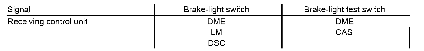 This ensures that the "Brake applied" signal is transmitted even in the event of a fault in the signal path. In contrast to the other control units, the two signals of the brake-light switch are simultaneously evaluated in the DME. This direct comparison of the two signals makes it possible to establish definitely whether the brake pedal is being operated. Furthermore, a malfunction of the brake-light switch can also be diagnosed. In addition, the function is still possible if one of the signals fails.