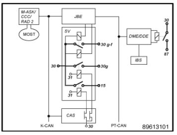 1. If an IBS is fitted, the power management in the DME/DDE monitors the standby current and the battery condition. If the battery charge state is close to the starting capability limit, the vehicle is wakened and a message to reset or shut down closed-circuit current cutoff relay is sent. The JBE regulates the bi-stable relay accordingly.