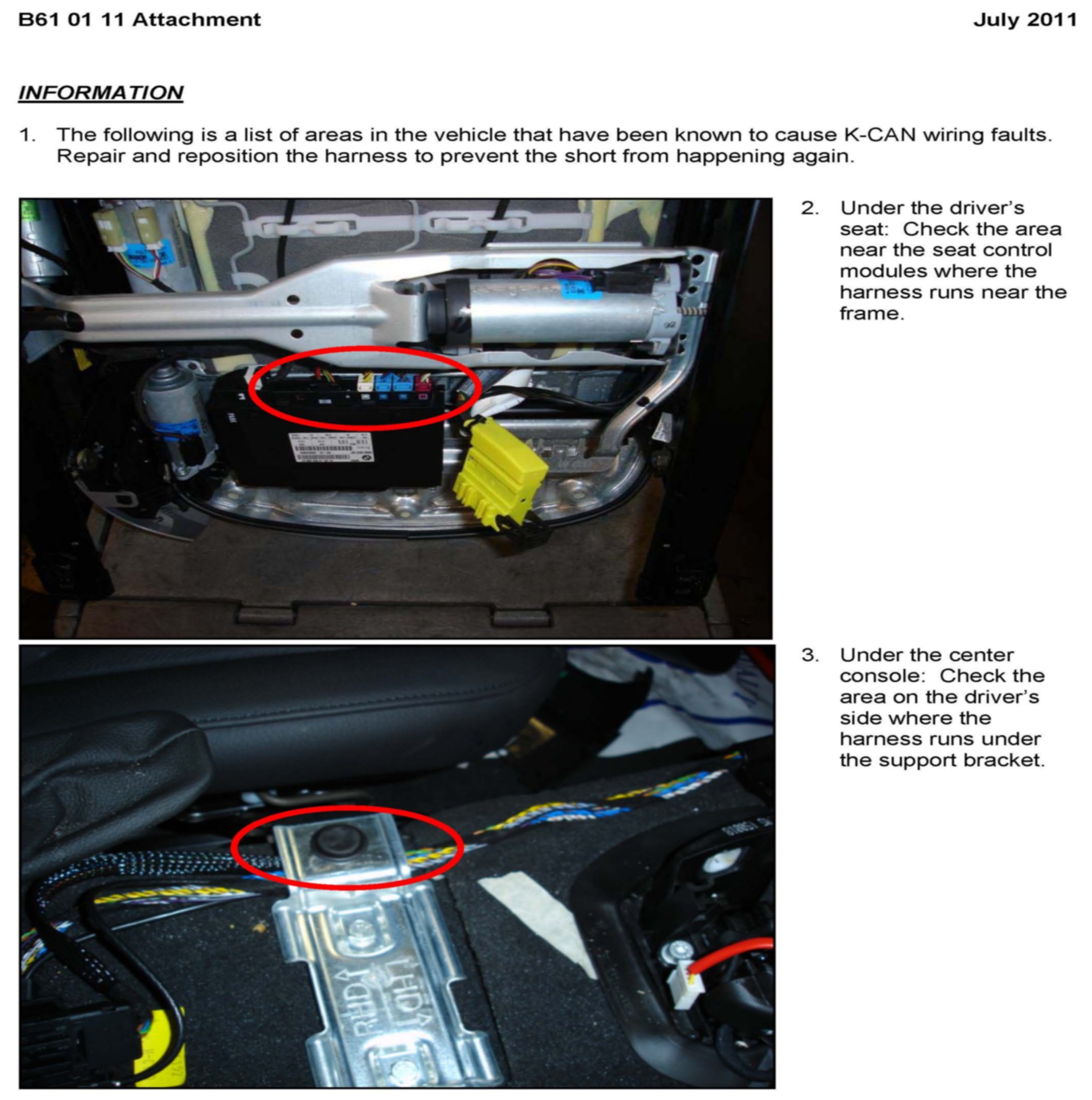 Troubleshoot any K-CAN communication faults by completing the CAN Analysis test plan with ISTA. This test plan will automatically be linked to the faults stored in the vehicle. If the test plan results state that the root cause of the communication errors is the K-CAN (wiring), follow the guidelines in the attachment for reported areas where the wiring may be shorted. [NEW]Thanks to Robert Davis of Irvine Eurocars, LLC, for submitting a PuMA Case with information about a new wiring short location (6).
