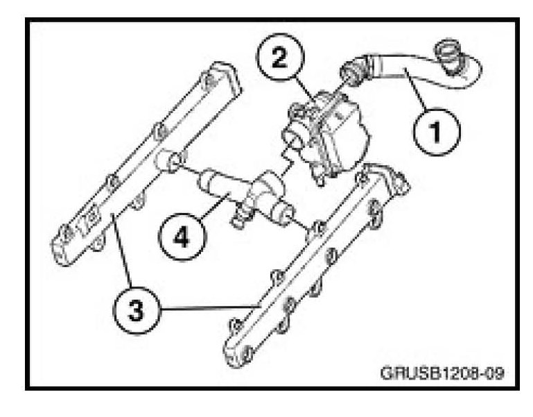 Remove and inspect the hose (1) located between the idle-air actuator and intake manifold. Remove and inspect the idle-air actuator (2). If debris is found, remove the debris, but do not replace the idle-air actuator. Remove and inspect both idle strips. If debris is found inside the idle strips, both idle strips must be replaced. Whenever rubber hose debris is found in the idle circuit, it will be necessary to replace the rubber hose (1) between the idle-air actuator and the intake manifold as well. The rubber hose (4) located between the idle strips should be inspected and cleaned; do not replace this item.