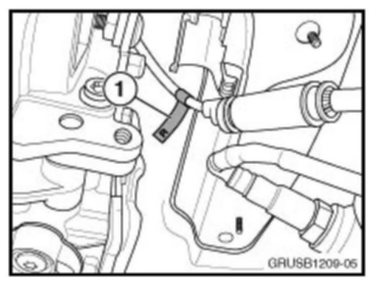 2. [NEW] Inspect the electrical harness for cylinder bank 1's post-catalytic converter oxygen sensor. The harness should be labeled with the letter "R" on a small white paper tag, wrapped around the corrugated harness protector (1).