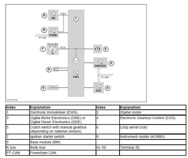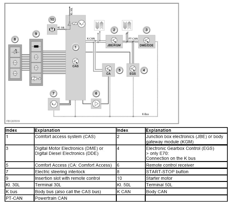 - The DME/DDE uses a random number and the secret code to calculate a request. The DME/DDE sends this request via the CAN data line (PT-CAN and K-CAN) and the K bus (also called CAS bus) to the CAS control unit.