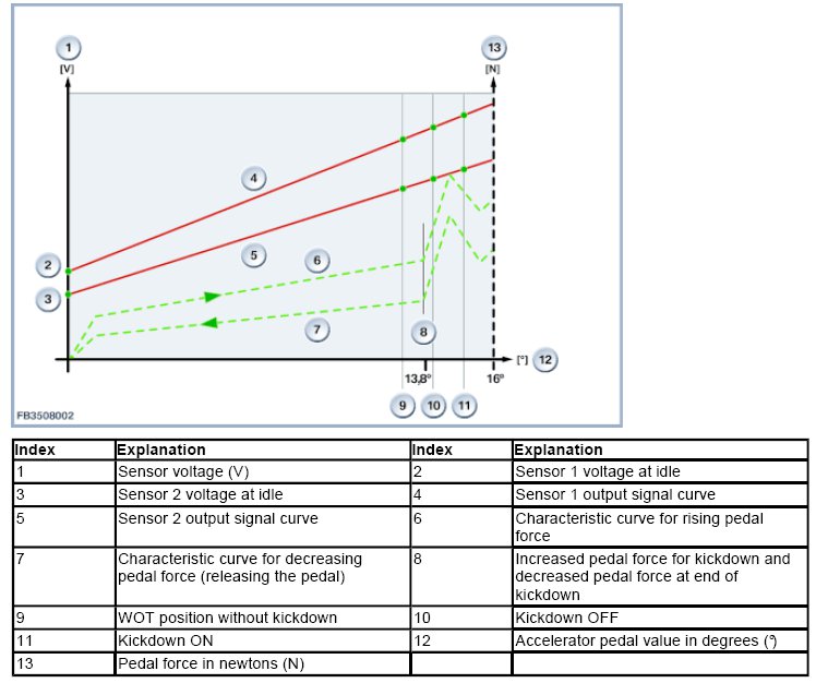 Start of kickdown phase: The detent position at which increased pedal force is required lies between a maximum of 13.8° and a minimum of 1.6° before the mechanical travel stop. On the characteristic curve for rising pedal force, the threshold value for kickdown ON must lie immediately after the maximum pedal force for kickdown. End of kickdown phase: The final position for increased pedal force occurs 1.6° before the mechanical travel stop at the earliest and 13.8° before it is reached at the latest. On the characteristic curve for falling pedal force, the threshold value for kickdown OFF must lie immediately after the maximum pedal force.