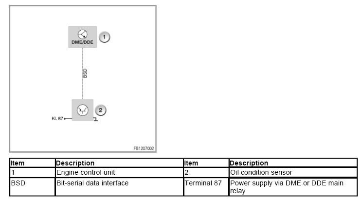 The oil condition sensor is connected via a bit-serial data interface to the engine management system. Power is supplied via terminal 87.