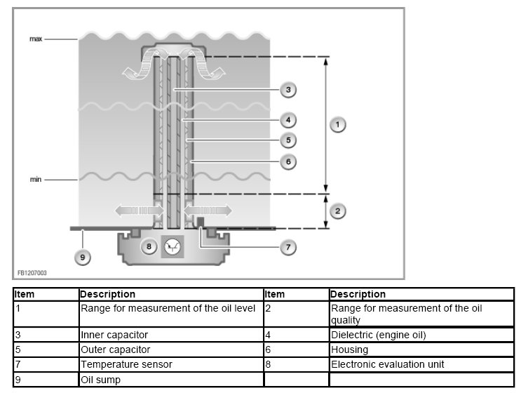 The oil level is measured for the electronic oil level check. The 2nd capacitor in the upper part of the oil condition sensor registers the oil level with the engine running. The capacitor is at the same level as the oil level in the oil sump. As the oil level changes, the capacitance of the capacitor changes. The electronic evaluation unit creates a digital signal from this. The engine management system uses this to calculate the engine oil level. The electronic oil level check is displayed on the Central Information Display (CID) as well as in the instrument cluster. On vehicles without CID, the oil level is only displayed in the instrument cluster.