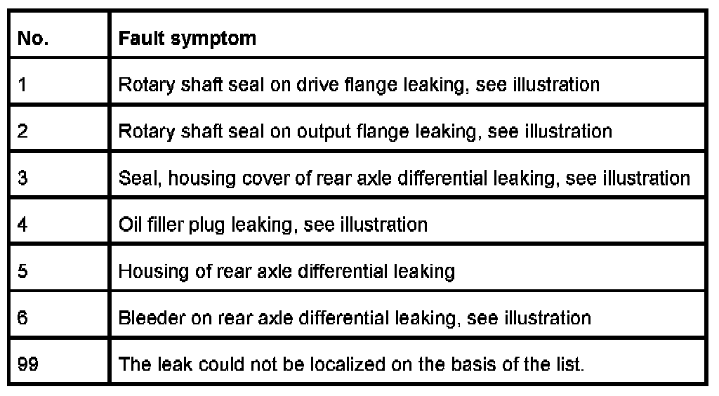 The following list shows all the currently known fault patterns that can lead to leaks at the rear axle. To localize the leak, sample pictures are shown after the list.