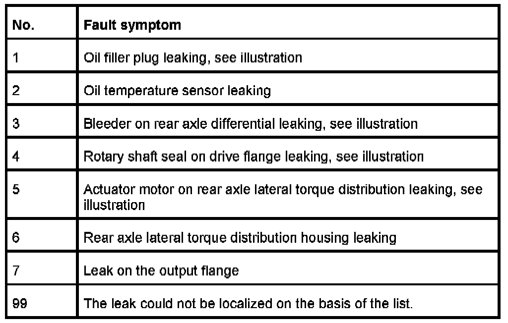 The following list shows all the currently known fault patterns that can lead to leaks at the rear axle with lateral torque distribution. To localize the leak, sample pictures are shown after the list.