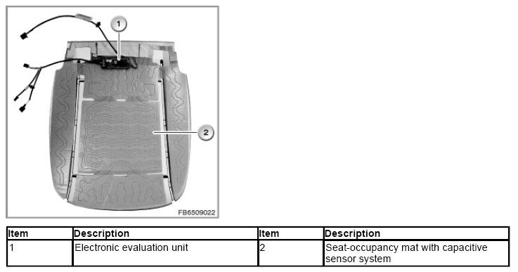 The passenger seat occupancy detection consists of a seat-occupancy mat with a capacitive sensor system. The occupancy of the front passenger seat is detected by measuring the resistance of the human body.