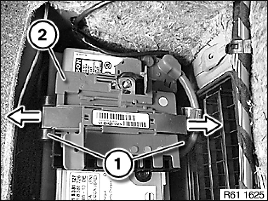 If necessary, using a screwdriver, expand locking bracket (1) at lower end and clip out.