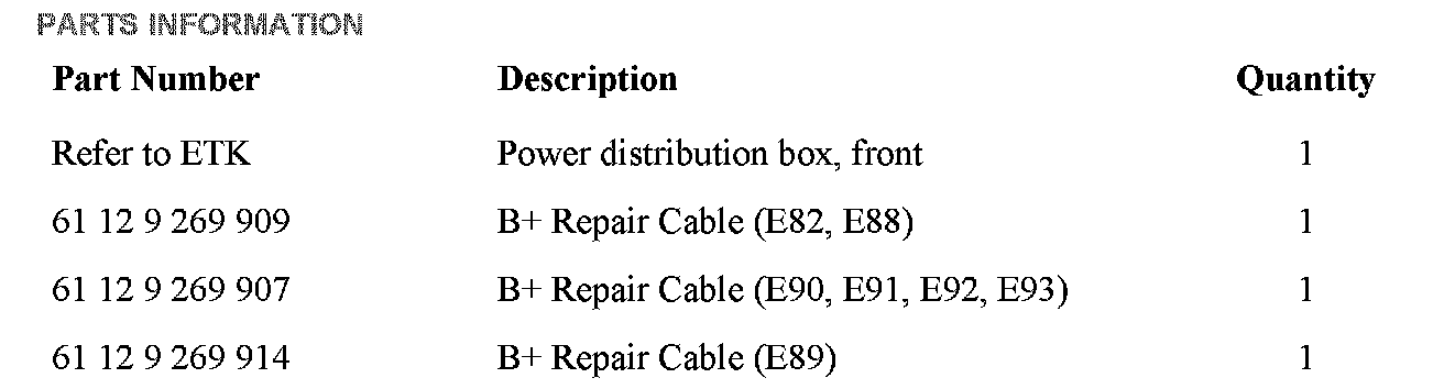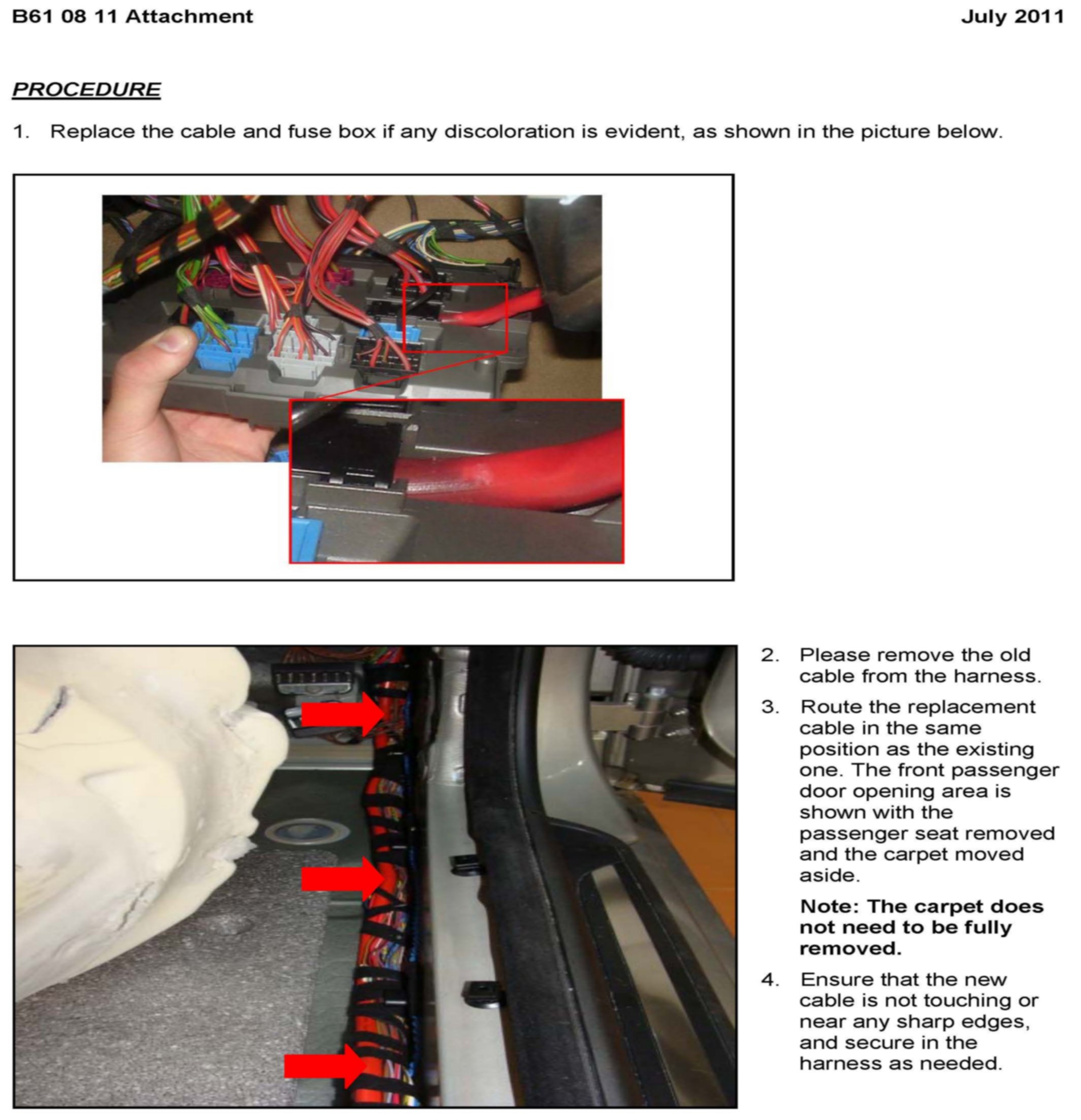 3. If discoloration is noted in the affected area, replace both the fuse box and the cable. The cable routes from the battery fuse box in the luggage compartment to the front fuse box along the main wiring harness, under the carpet on the right side of the vehicle interior. There are currently no repair instructions to replace this cable. Refer to ISTA Repair Instructions REP 51 47 315 and 51 47 440 for removing all the carpets in order to gain access to the harness. Route the new cable in the exact same way as the original cable. Refer to attachment.