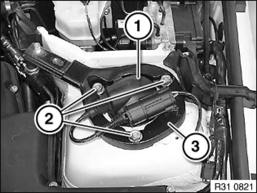 Release nuts (2) and remove suspension cross-brace ring (3).