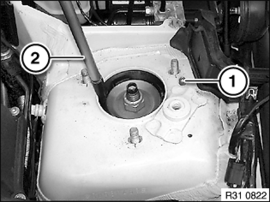 Wrap lower end of screwdriver in adhesive tape to avoid damaging the paintwork on the spring strut dome.