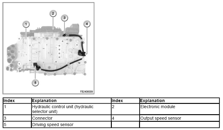 The drive and output speed sensors are Hall sensors. Both sensors are located on the upper timing case. They are connected by means of a wiring harness and a connector with the EGS control unit.
