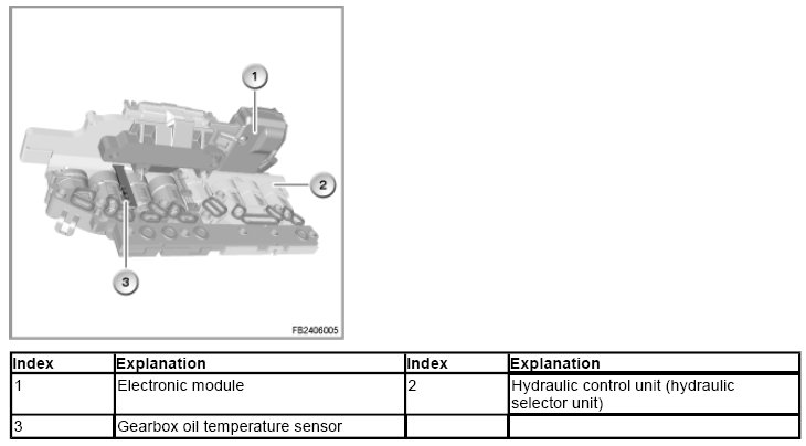 For optimal shift characteristics, the EGS control unit requires the input signal from the gearbox temperature sensor. At very low gearbox oil temperatures, the shifting forces to be applied are high; at operating temperature, they are correspondingly low. The gearbox temperature sensor is installed in the mechatronics module. Activation of the converter lockup clutch, among other things, is controlled according to the gearbox oil temperature.