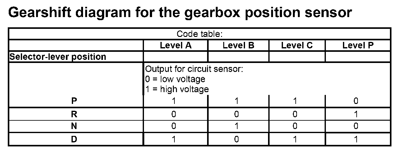 The 5 inputs of the gearbox position sensor show each selector-lever position. The selector-lever position is transferred to the gearbox position sensor across a Bowden cable and is converted by the gearbox position sensor into a code. This code is transferred to the gearbox control and engine management system.