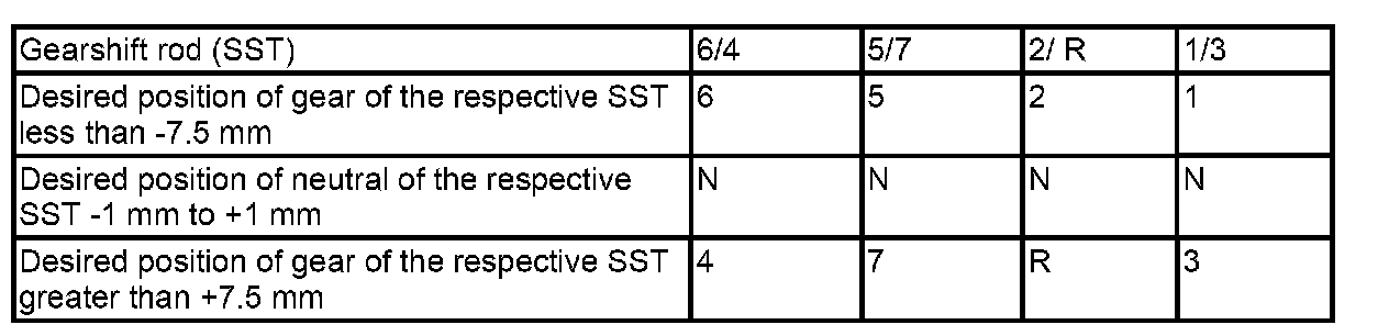 Explanations for the following table: N is inserted if the position of the respective gearshift rod is between -1 mm and +1 mm. The gears 3, R, 4, 7 are inserted if the position of the respective gearshift rod is 7.5 mm or greater. The gears 1, 2, 6, 5 are inserted if the position of the respective gearshift rod is -7.5 mm or less.