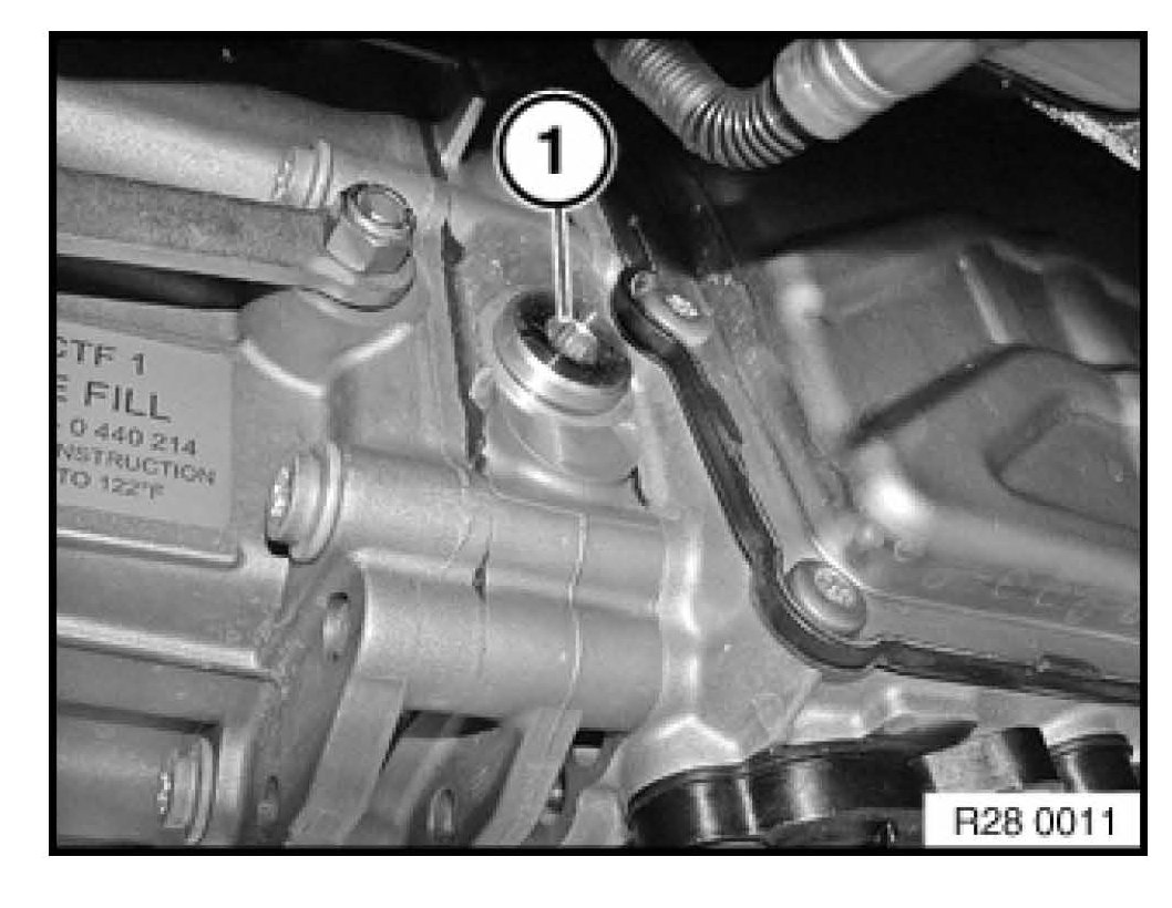 ^ Remove the filling plug from the transmission housing and refill the transmission with approximately 8 liters of DCTF-1 fluid, until it starts to overflow.