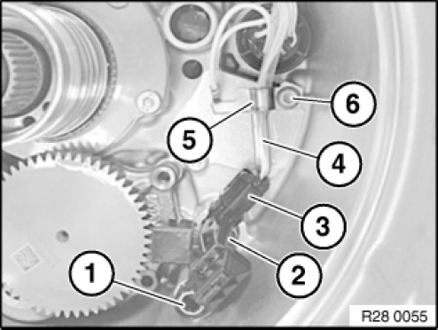 Removing wiring harness (4) with earth terminal (5) from housing.