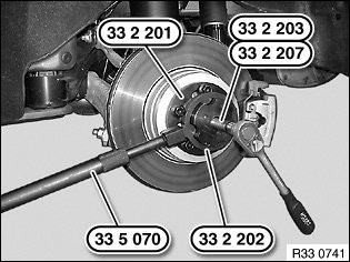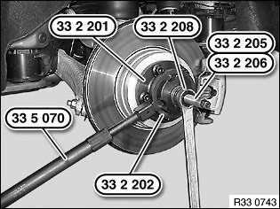 Screw on special tools 33 2 203, 33 2 207 and 33 2 201 with all wheel bolts to drive flange.