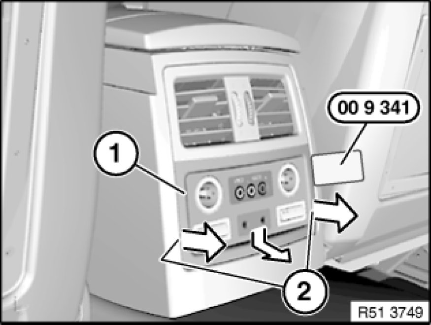 Unclip rear insert (1) with special tool 00 9 341 at retaining points (2) and pull back in direction of arrow.