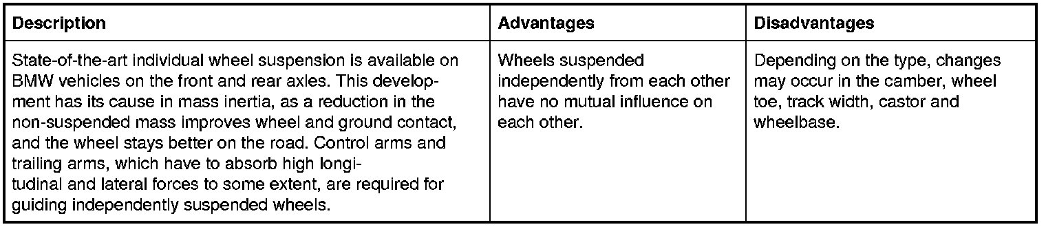 Those parts which connect the wheel to the mostly load-bearing floor elements of the bodywork and guide it in the required direction belong to the wheel suspension. They are connected by axles or other comparable structures and guided by the arms. The wheel suspension plays a decisive role in the handling characteristics of a vehicle. Two main groups have to be distinguished: 1. Rigid axle suspension and 2. Independent wheel suspension.