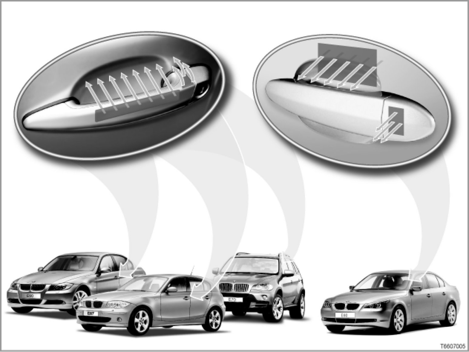 The vehicle is unlocked when the outside door handle is gripped or pulled. Condition: The ID transmitter must be located no further than 1.5 m from the aerial in the outside door handle.
