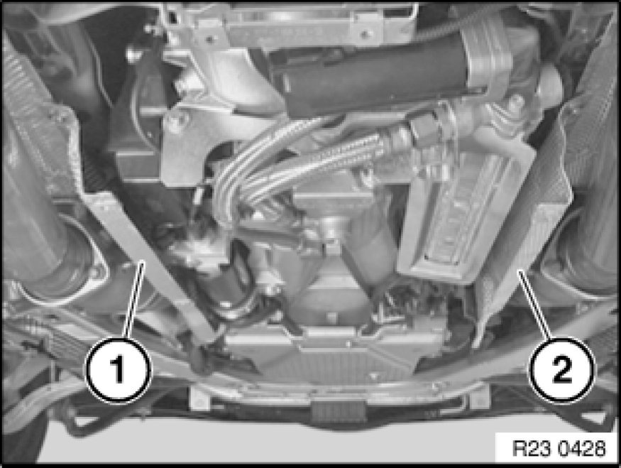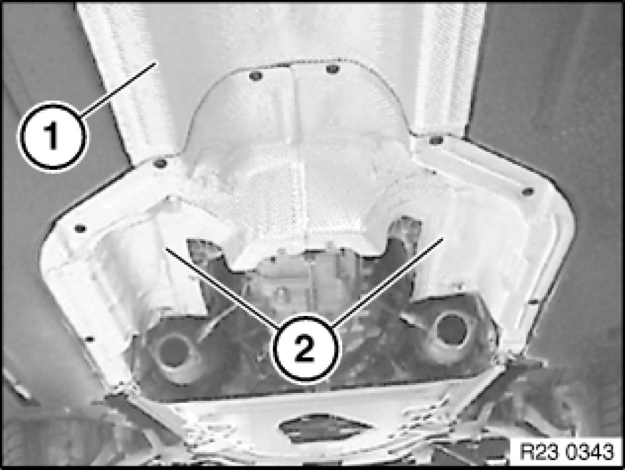 Remove heat shields (1) and (2).