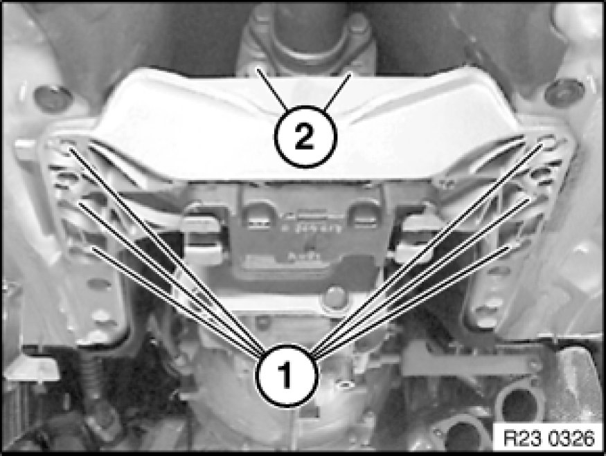 Release screws (1) and nuts (2) and remove cross-member.