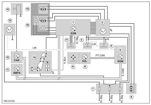 The button for the steering column adjustment evaluates the steering column switch cluster (SZL). The steering column switch cluster transmits the requests to the body gateway module (KGM) via the PT-CAN data bus. The KGM implements the signal on the K-CAN.