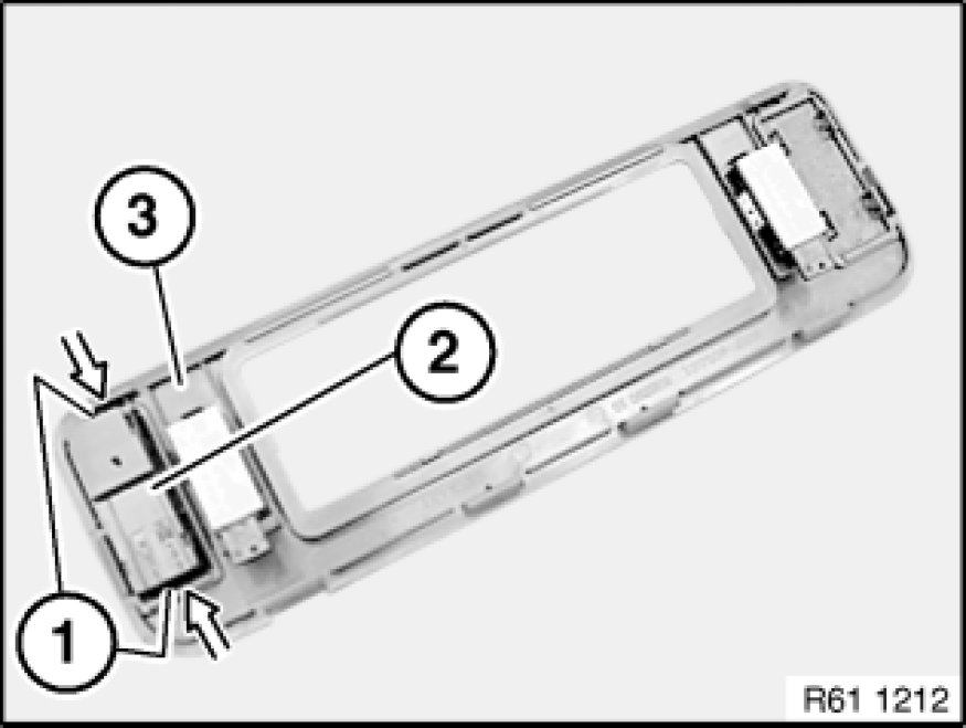 Press locks (1) and unclip emergency call button (2) downwards from front roofliner trim (3).