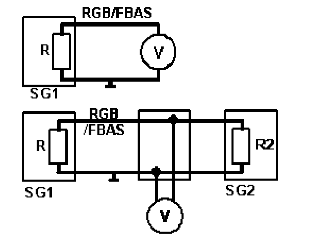 In the case of measurement without adapter, the second Control module (SG2) is disconnected. Upper circuit. For this measurement, the signal level is only measured via the resistance R. This is why a measurement without adapter leads to a double signal level.