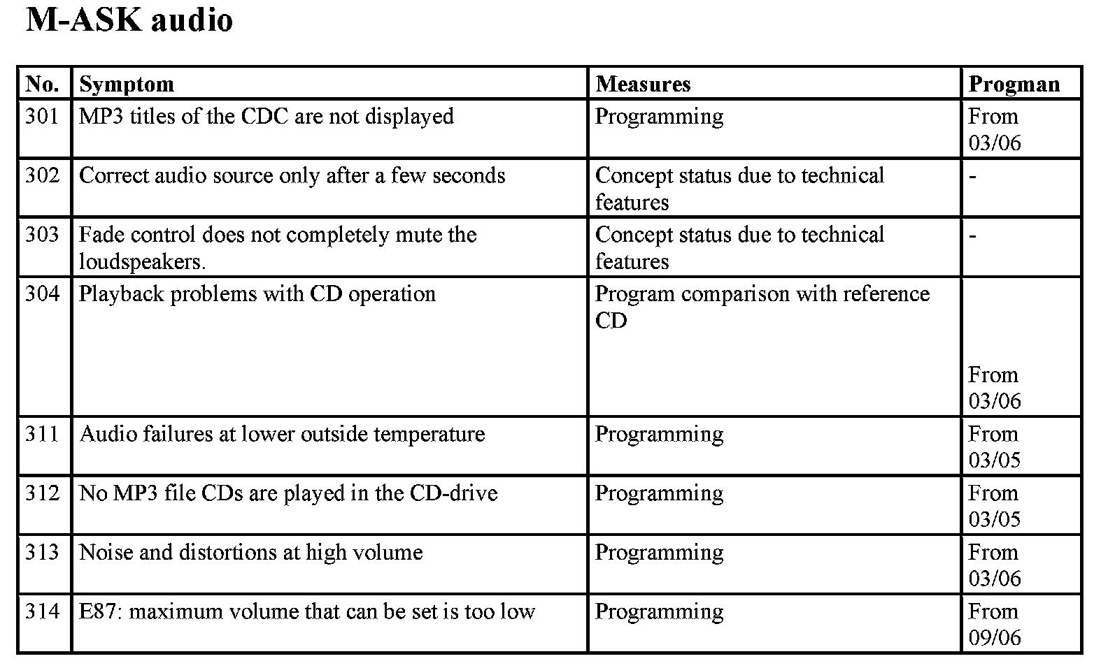 The navigation system Business (M-ASK) is a complex control module with a large number of possible fault profiles. The following list shows known symptoms in the functional area M-ASK audio and navigation. Fault profiles from the functional areas of telephone and Telematic services as well as integrated heating / air conditioner control are not covered in this test module.