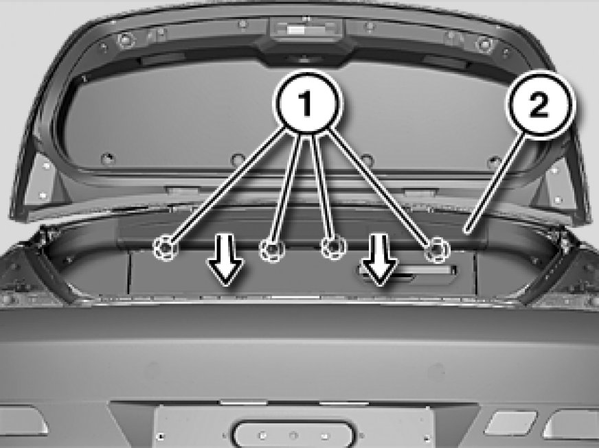 Release clips (1) and remove luggage compartment trim panel (2) towards bottom.