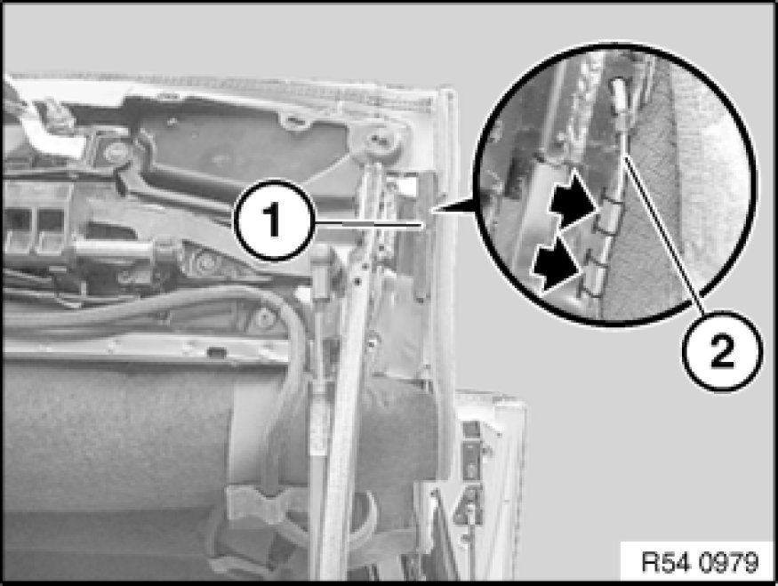 Disengage tensioning spring (2) and feed with tension cable (3) out of convertible top frame.