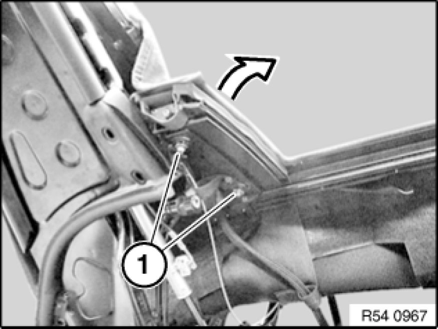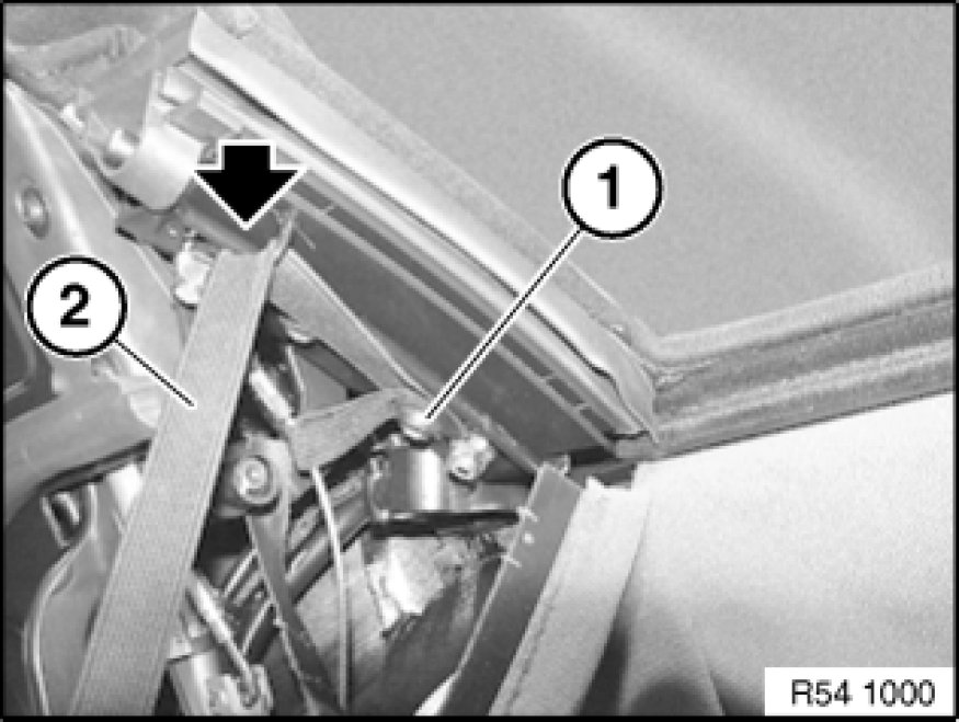 Detach convertible top adhesive tab (1) from convertible top frame.