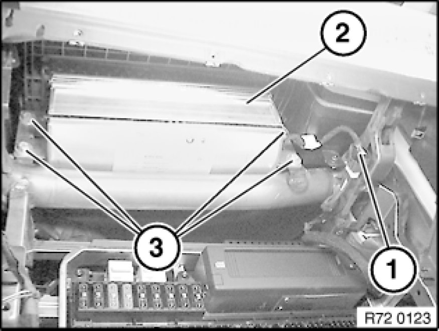 Release screws (3) and carefully feed out airbag module (2) towards bottom.