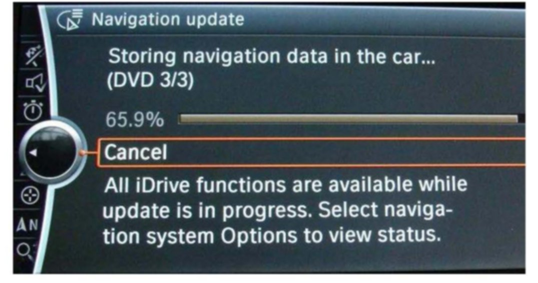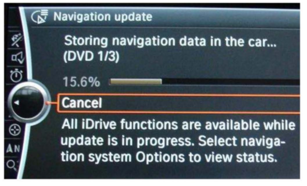 4. Insert the CIC navigation road map update DVD #1. The update process will start automatically, with the progress shown visually on the screen.