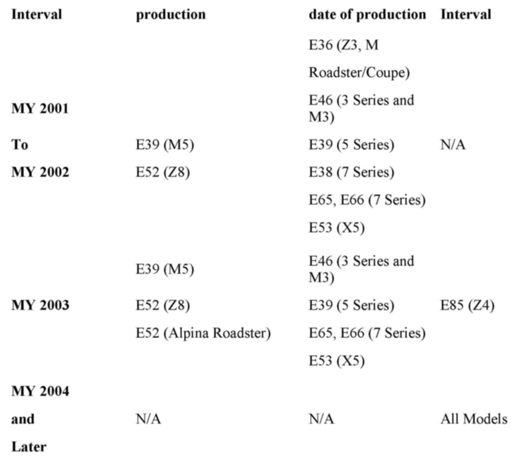 The summary above details the BMW conversion, by model year (MY) and model, to a long-term antifreeze/coolant solution.