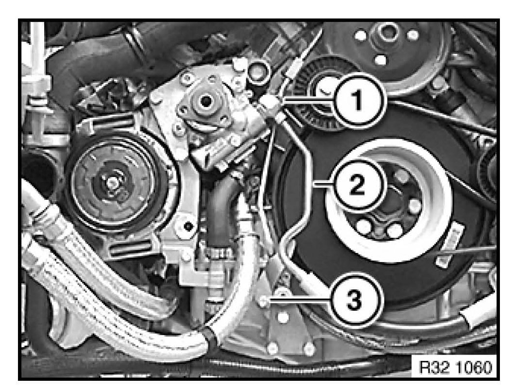 steering pump, it is possible to install the power steering pressure line under tension. Excess tension on the pressure line, combined with vibrations, could lead to a leak at the connection point (1). To eliminate the possibility of leaks from the power steering pressure line, it is imperative to follow the procedure listed in Repair Instruction RA 32 41 332 "Replacing pressure line for power steering (S85)". If necessary, the mounting flange (3) for the power steering line can be elongated with a round file to reduce tension during installation. However, if the flange is modified, then the corresponding bore must be treated with anti-corrosion paint.