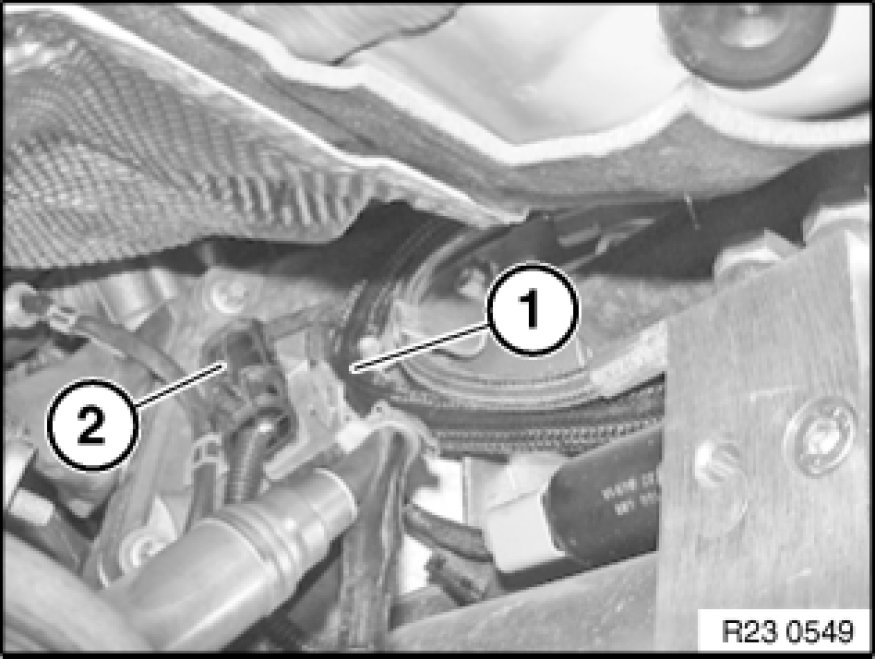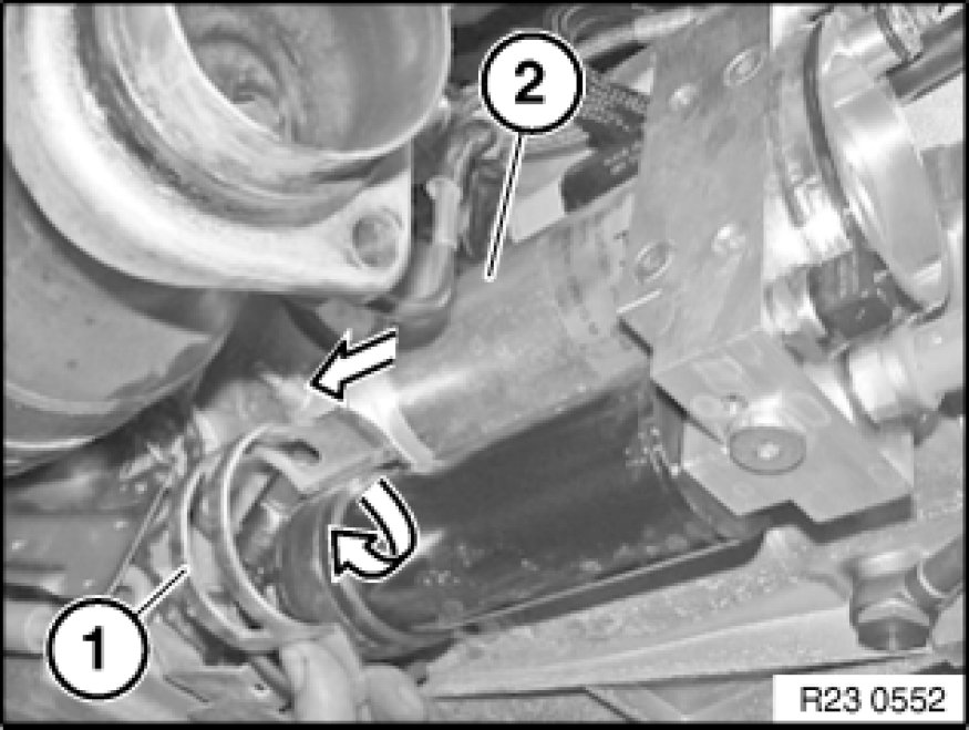Carefully detach reservoir in direction of arrow and secure or tie up to transmission with cable tie.