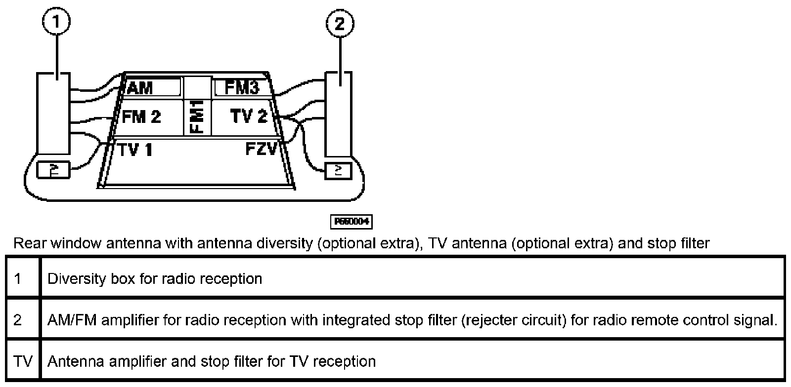 The receiver is accommodated together with the antenna in the interior rear-view mirror. The receiver transfers received radio signals via the FZV line to the central body electronics control module where they are evaluated.