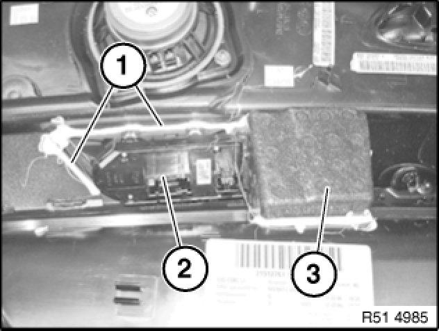 Apply new bead (1) of hot adhesive to switch for door mirror (2).