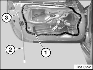 In case of replacement or partial detachments, lay butylene tape (sourcing reference: BMW Parts Service) depending on the conditions on inner door panel or sound insulation.