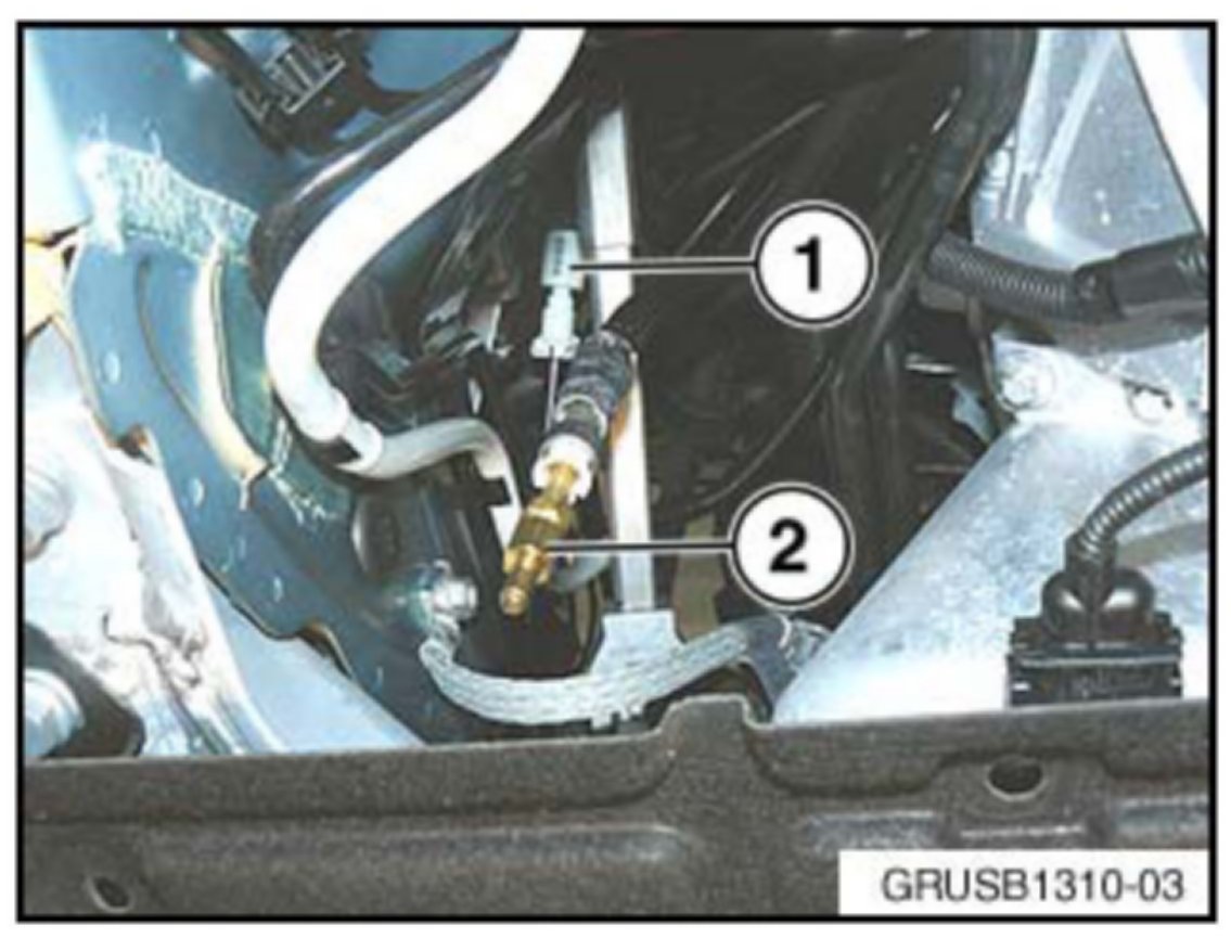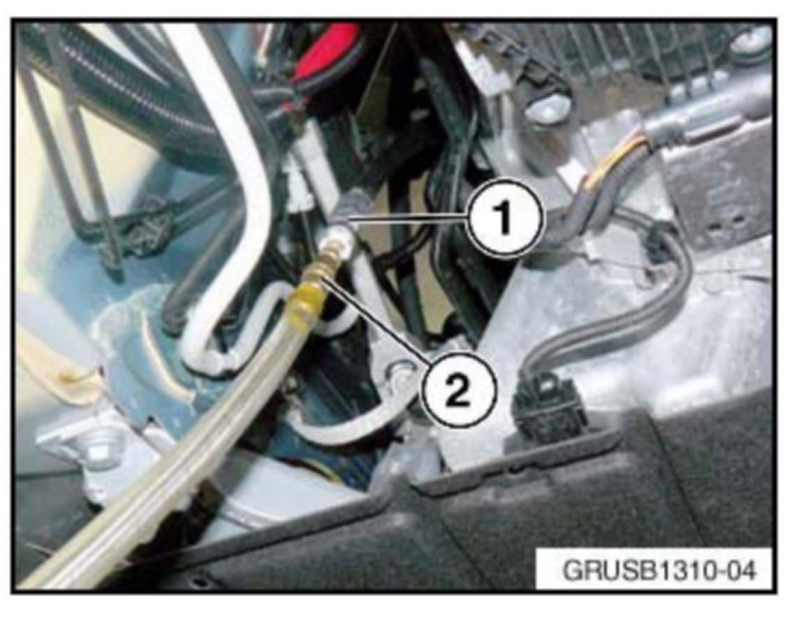 2. Lift the vehicle to access the under body cover protecting the low pressure connection (1) near the left frame rail.