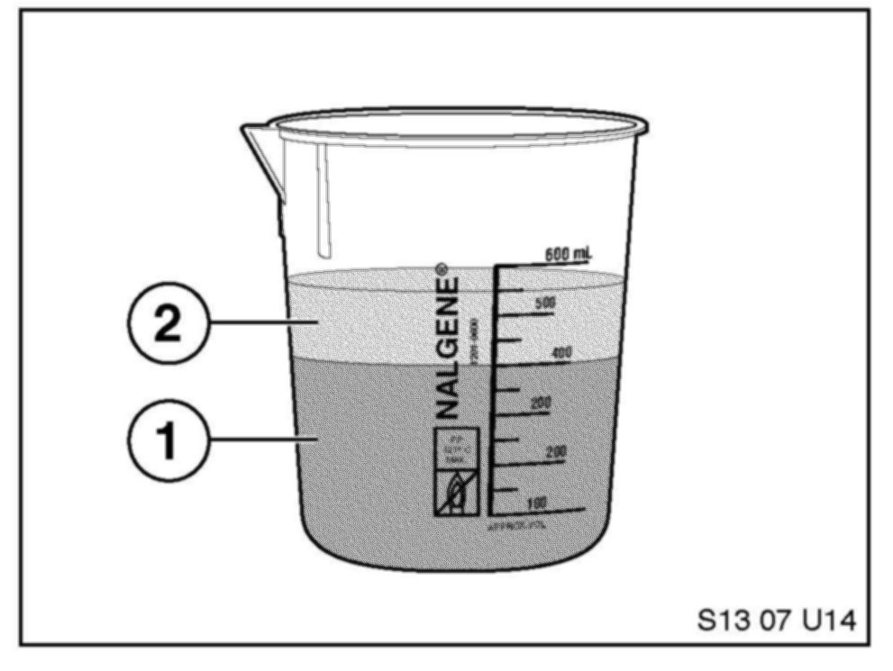 5. Pour 400 ml of fuel (1) and 150 ml of cleaner concentrate (2) into the beaker supplied in the kit.