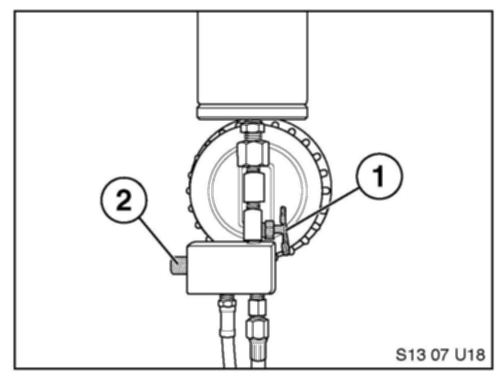 18. Release the pressure from the applicator cylinder with the pressure release button (2). Close the shutoff valve (1).