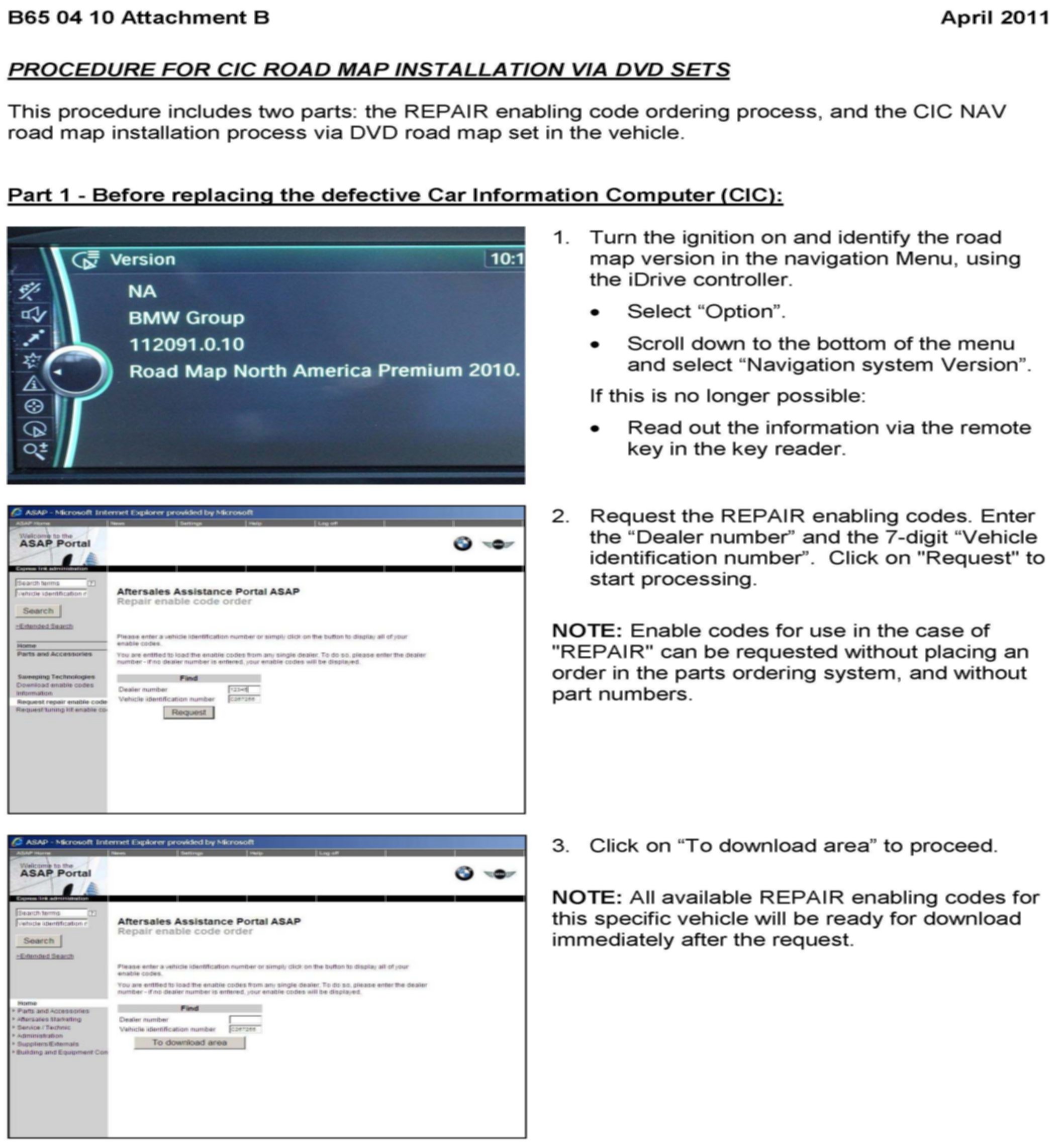 When installing the CIC NAV road map via the DVD road map set, the REPAIR enabling code must be requested through ASAP. Refer to Attachment C.