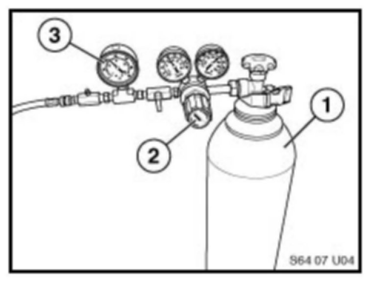 8. Once the proper adapters have been fitted, connect the nitrogen bottle (1) with the pressure reducer (2) to the pressure gauge (3). Connect the special hose (64 5 121) to the fitting on the pressure gauge and the test adapter on the vehicle.