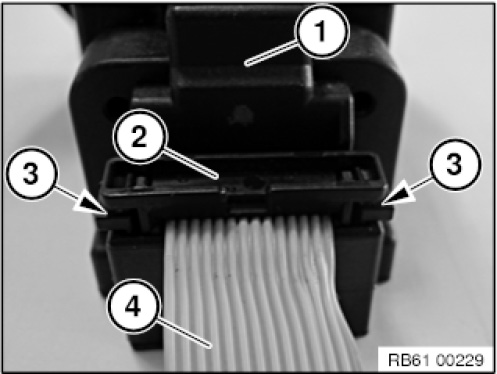 1. Check both sides of plug connection of ribbon cable (2) to slide-in unit for radio-operated key (1) for correct locking (3).