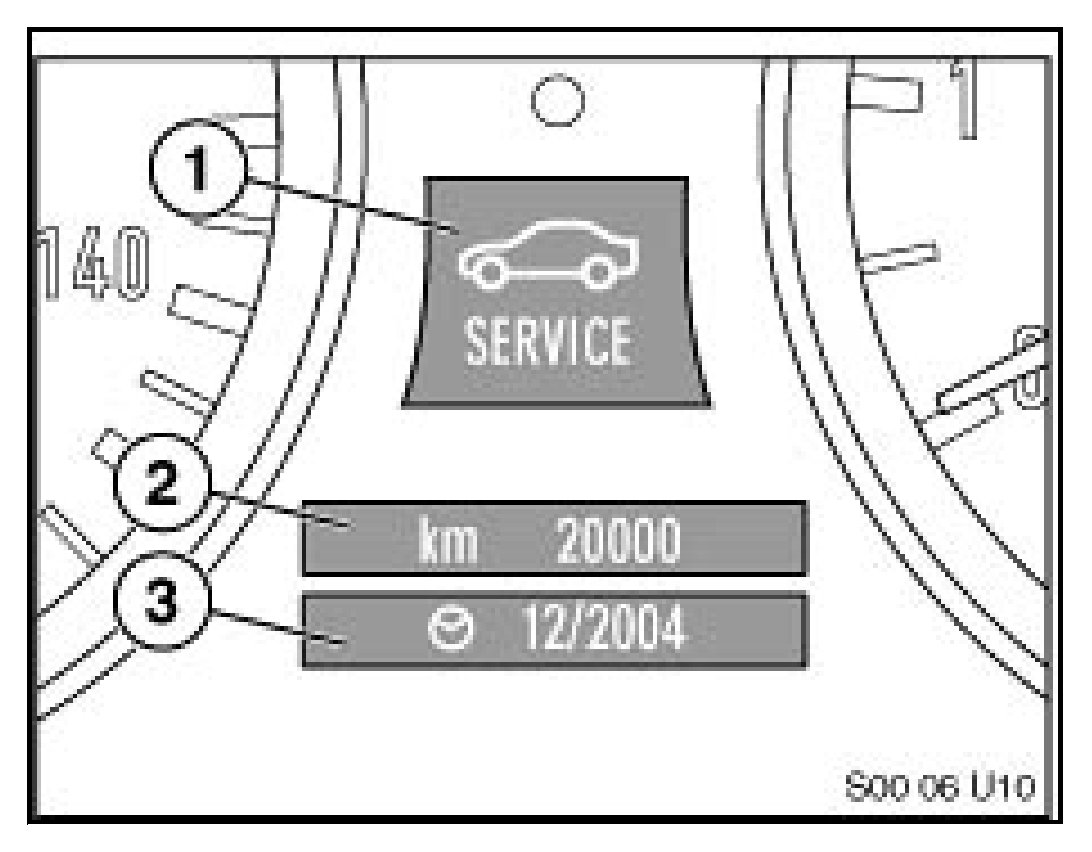 A. The Service Need Display (SBA) , located in the Instrument Cluster under the Speedometer, is the evolution of the SIA4 Service Interval Display. When the ignition (KL15 Terminal) is on, the SBA appears briefly. The first line specifies the mileage range before the next service is due. The second line, displayed by a clock symbol, specifies the time range before the next service is due. If service is overdue, a minus sign ("-") will appear with the overdue mileage or time.